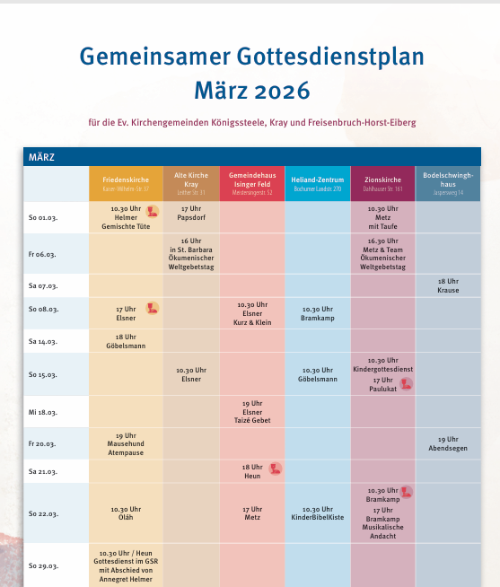 Leider hat sich in den Gottesdienstplan ein Fehler eingeschlichen. Der Gottesdienst zum Weltgebetstag in der Zionskirche beginnt um 16.30 Uhr am 06.03., Kaffee und Kuchen ab 15.00 Uhr.