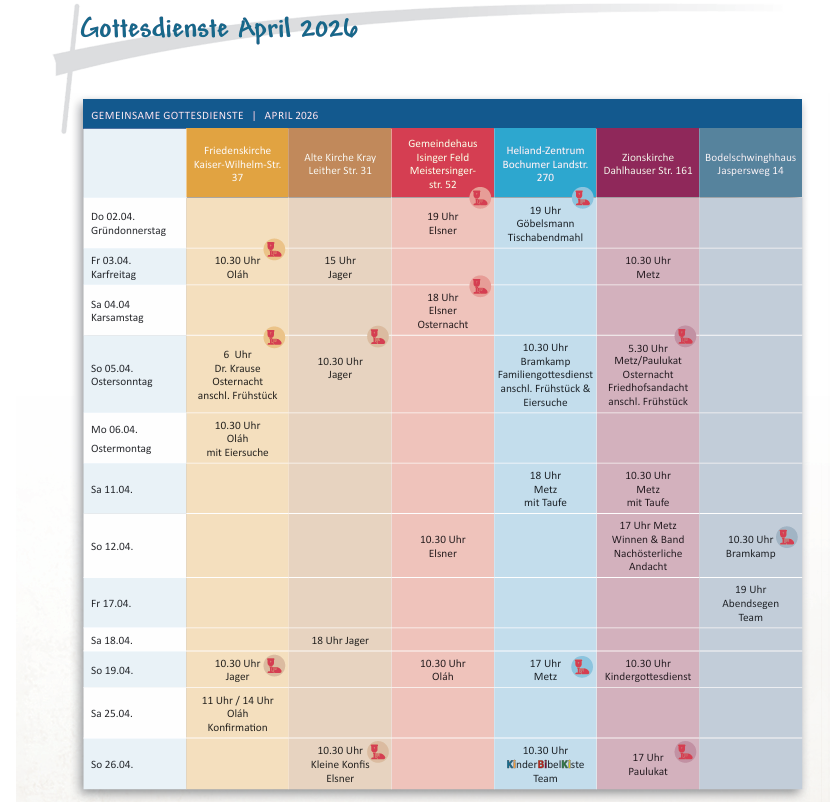 Das Presbyterium unserer Gemeinde hat in seiner Sitzung am 11.03.26 beschlossen, die Fusion mit den Evangelischen Kirchengemeinden Königssteele und Kray nicht weiter anzustreben. Diese Entscheidung wird in einer Gemeindeversammlung am 15.04.26 ab 18.00 Uhr im Heliand-Zentrum umfassend begründet und anschließend ist Raum für Nachfragen und Diskussionen.
