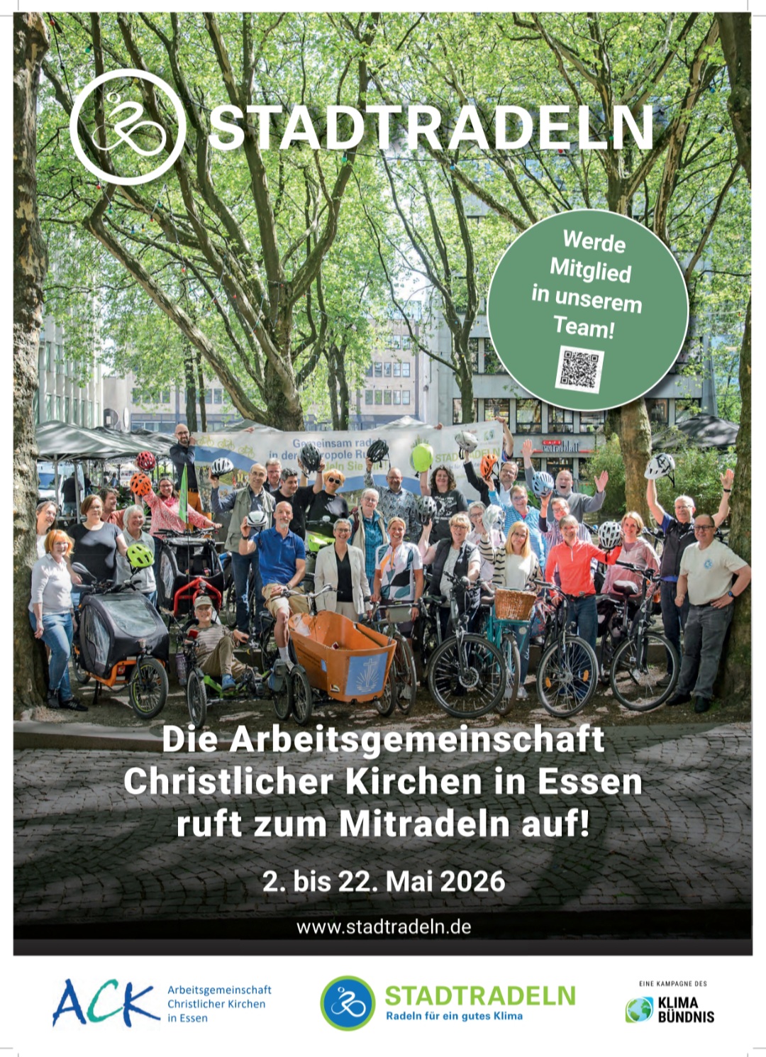 Die Stadtradeln-Aktion in Essen ist eine jährliche Kampagne, bei der Bürgerinnen und Bürger dazu aufgerufen werden, möglichst viele Wege mit dem Fahrrad zurückzulegen. In einem Zeitraum von 21 Tagen, zwischen dem 2. und 21. Mai, sammeln Teams wie Schulklassen, Unternehmen, Vereine oder der ACK- Arbeitskreis christlicher Kirchen – gemeinsam Kilometer, die online oder per App erfasst werden. Ziel ist es, den Klimaschutz zu fördern, den Radverkehr zu stärken und ein Bewusstsein für nachhaltige Mobilität zu schaffen. Pfarrerin Metz hat für das Team des ACK ein Unterteam FHE gegründet und freut sich, wenn Sie dabei sind. Sprechen Sie sie dazu gerne an.